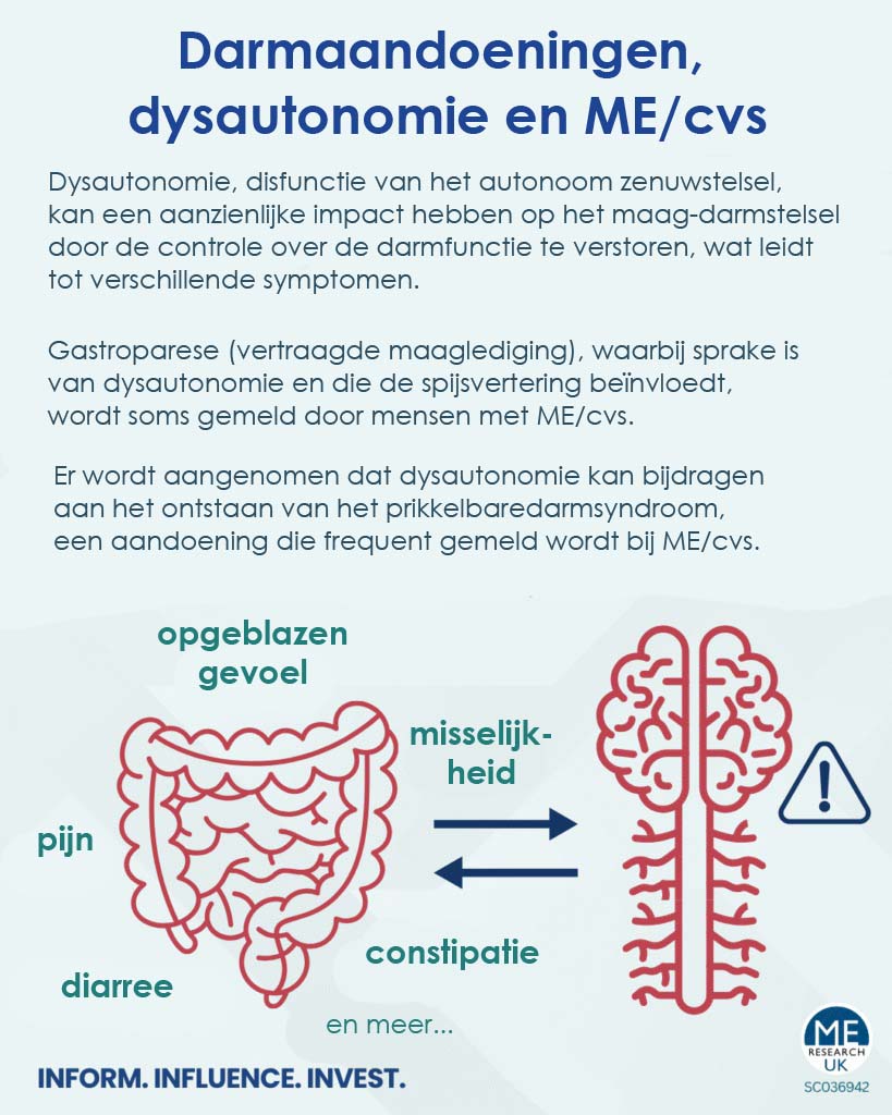 Dysautonomie, een stoornis van het autonome zenuwstelsel, kan een aanzienlijke impact hebben op het maag-darmstelsel door de controle over de darmfunctie te verstoren, wat kan leiden tot symptomen zoals misselijkheid, buikpijn, een opgeblazen gevoel, constipatie en diarree. Mensen met ME/cvs melden vaak darmproblemen of hebben comorbiditeiten die verband houden met dysautonomie, zoals posturaal orthostatisch tachycardiesyndroom (POTS).