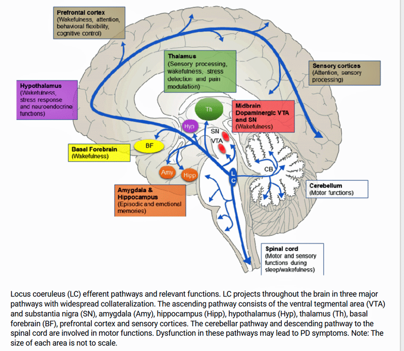 De lage noradrenalineniveaus in de hersenen van Goldstein/Aregawi komen mogelijk goed overeen met de bevindingen van Hendrix et al. De belangrijkste producent van noradrenaline in de hersenen – de locus caeruleus – heeft sterke verbindingen met neuronen van het sympathisch zenuwstelsel en de hypothalamus en hersenstam. (Merk op dat de recente (niet-gepubliceerde) autopsieresultaten ook de hypothalamus noemden.