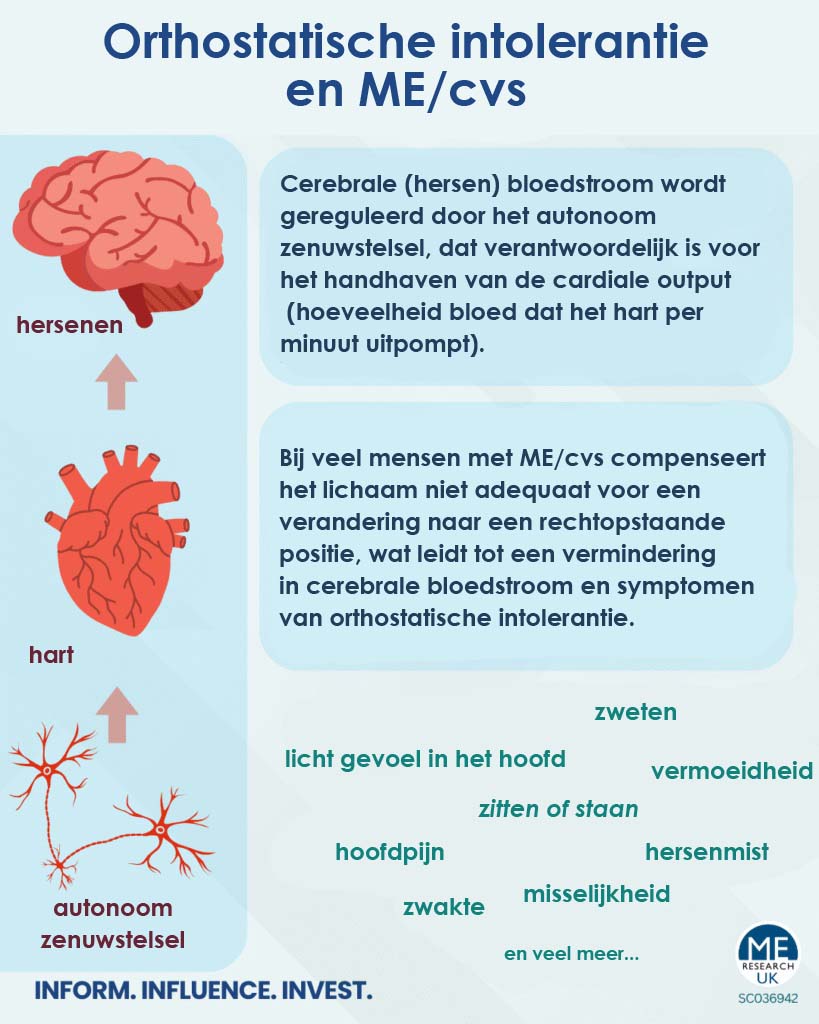 Orthostatische intolerantie, een veelvoorkomend probleem bij mensen met ME/cvs, is een aandoening waarbij het lichaam niet goed kan compenseren voor een rechtopstaande positie. Dit zou leiden tot een verminderde bloedtoevoer naar de hersenen en symptomen zoals duizeligheid, vermoeidheid en zwakte. Een deel van de mensen met orthostatische intolerantie voldoet ook aan de criteria voor het posturaal orthostatisch tachycardiesyndroom (POTS), waarbij een buitensporige verhoging van de hartslag een van de symptomen is.