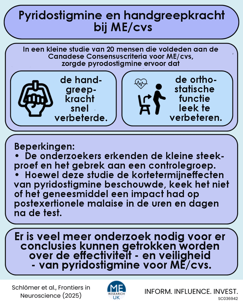 In het discussiegedeelte van het artikel erkennen de onderzoekers de beperkingen van hun studie, waaronder de kleine steekproefomvang en het ontbreken van een controlegroep. ME Research UK merkt ook op dat dit onderzoek weliswaar het effect van pyridostigmine op de handgreepkracht en orthostatische intolerantie op korte termijn heeft onderzocht, maar niet heeft gekeken of het medicijn een invloed had op postexertionele malaise (PEM) in de uren en dagen na de test. Er is meer onderzoek nodig om te begrijpen of en hoe pyridostigmine PEM beïnvloedt bij mensen met ME/cvs.