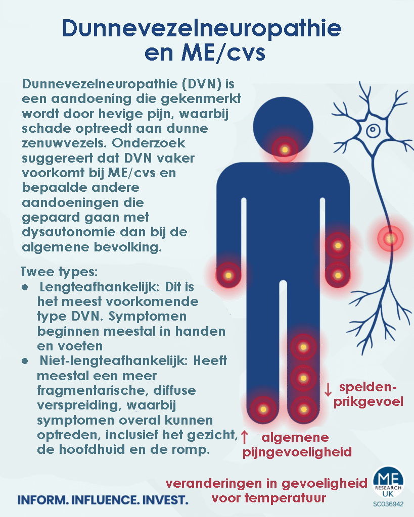 Dunnevezelneuropathie (DVN) is een aandoening waarbij schade optreedt aan dunne zenuwvezels, gekenmerkt door hevige pijn die meestal begint in de ledematen. Het is een vorm van perifere neuropathie die zenuwen buiten de hersenen en het ruggenmerg aantast. Hoewel het een minder bekende aandoening is en daarom een ​​bredere wetenschappelijke bewijsbasis vereist, suggereert onderzoek dat DVN vaker voorkomt bij ME/cvs en bepaalde andere aandoeningen die gepaard gaan met dysautonomie dan bij de algemene bevolking.