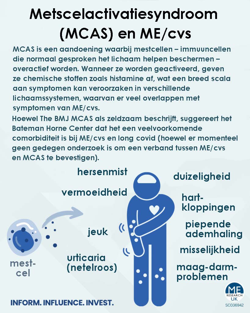 Mestcelactivatiesyndroom (MCAS) is een aandoening waarbij mestcellen – immuuncellen die normaal gesproken het lichaam helpen beschermen – overactief worden. Wanneer ze worden geactiveerd, geven ze chemische stoffen zoals histamine af, wat een breed scala aan symptomen kan veroorzaken in verschillende lichaamssystemen, waarvan er veel overlappen met symptomen van ME/cvs.
